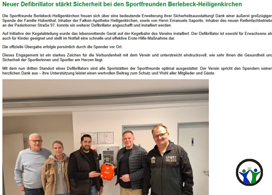 Die Sportfreunde Berlebeck-Heiligenkirchen freuen sich über eine bedeutende Erweiterung ihrer Sicherheitsausstattung! Dank einer äußerst großzügigen Spende der Familie Hübenthal, Inhaber der Falken-Apotheke Heiligenkirchen, sowie von Herrn Emanuele Saporito, Inhaber des neuen Reifenfachbetriebs an der Paderborner Straße 97, konnte ein weiterer Defibrillator angeschafft und installiert werden. mehr lesen...