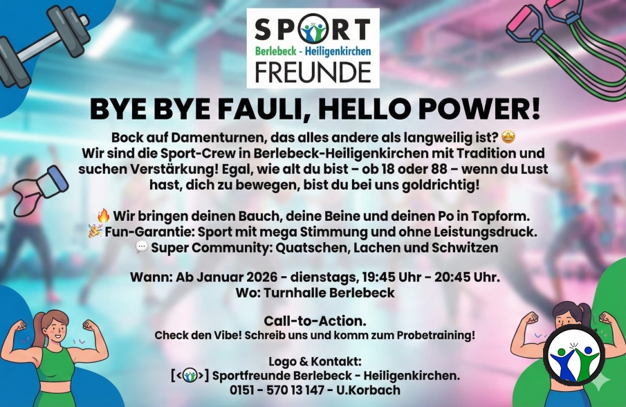 Wir sind die Sport-Crew in Berlebeck-Heiligenkirchen mit Tradition und suchen Verstärkung! Egal, wie alt du bist - ob 18 oder 88 - wenn du Lust hast, dich zu bewegen, bist du bei uns goldrichtig! mehr lesen...