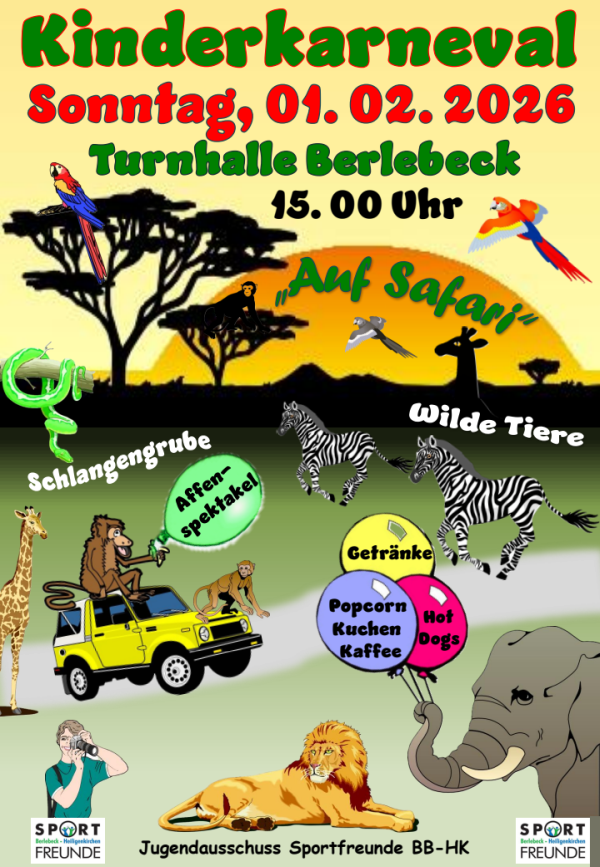 Am Sonntag, 01.02.2026 ab 15.00 Uhr lädt der Jugendausschuss der Sportfreunde Berlebeck-Heiligenkirchen alle Kinder, Eltern, Großeltern und Gäste herzlich zum 33. Kinderkarneval in die Berlebecker Turnhalle ein.